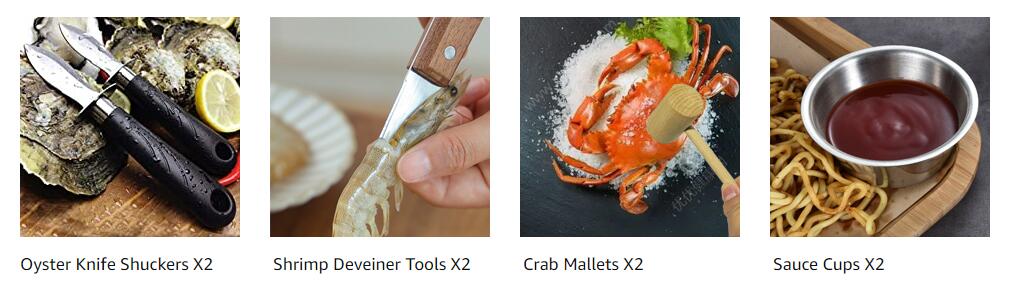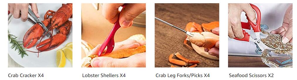 - Professional seafood tools set includes 4 zinc alloy crab crackers, 4 stainless steel crab leg forks/picks, 4 food-grade plastic lobster shellers, 2 stainless steel seafood scissors, 2 stainless steel oyster knife, 2 stainless steel shrimp deveiner tool, 2 stainless steel sauce cups, 4 wooden lobster crab mallets and 1 storage bag.