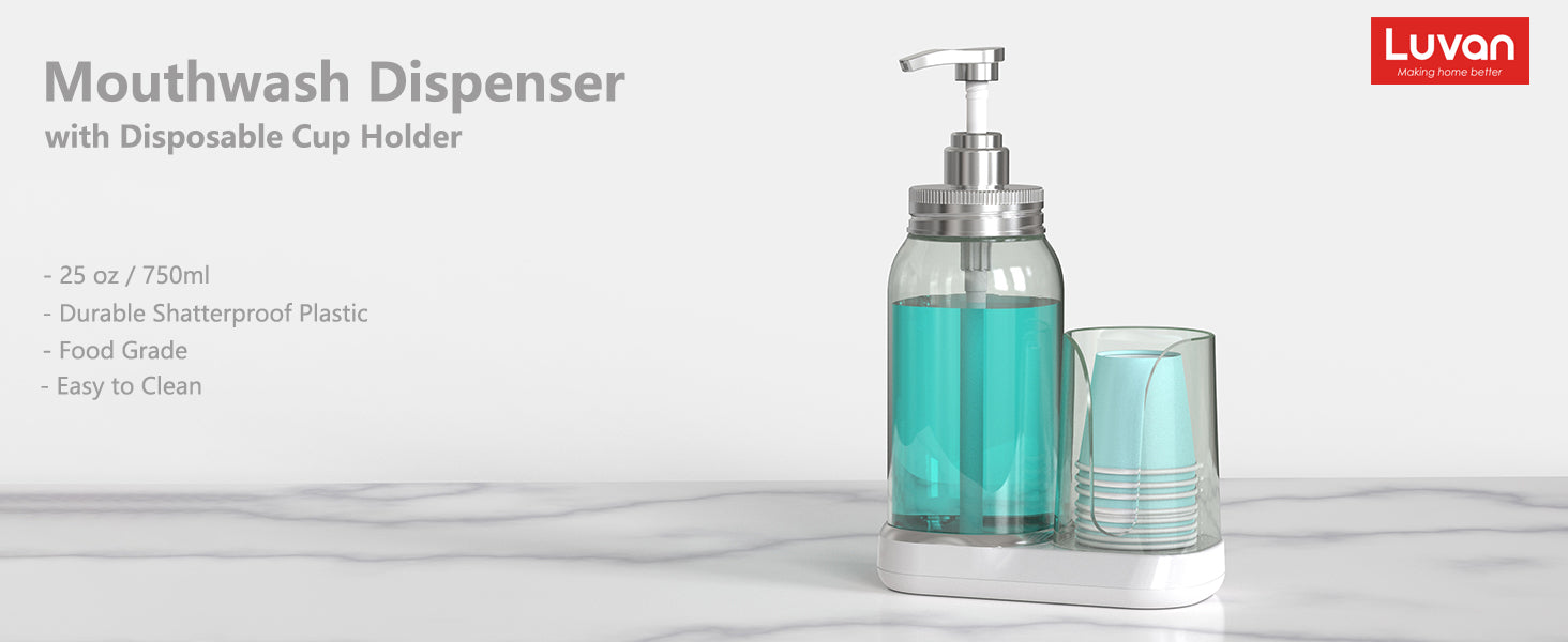 - The wide opening of the Luvan mouthwash dispenser holds 25oz/750ml of mouthwash, which is larger than most dispensers on the market, eliminating frequent refills. The clear blue visible container makes it easy to see how much volume of liquid is left inside, helping you refill and rinse quickly and easily. Suitable for most types of liquids. Great for bathrooms, kitchens, offices, toilets, etc.
