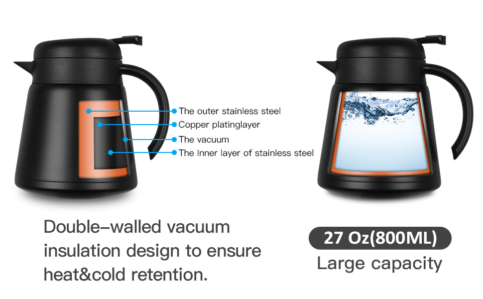 - 【TEMPERATURE RETENTION】 --- 12+ Hrs Heat&24+ Hrs Cold Retention with double-walled stainless steel vacuum insulation design. An ideal pot for coffee,tea,beverage,milk etc.