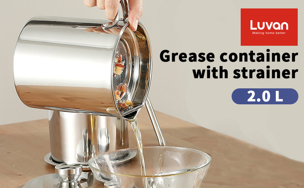 - 【Versatile Use】The fully loaded capacity is 2L/68oz, and the optimal capacity is 1.8L/61oz. This oil container with strainer helps us separate food from fat and reduce fat intake. Perfect for home family and restaurant kitchen to store bacon oil, grease, fat, cooking oil, coconut oil, frying oil, hot oil, etc.