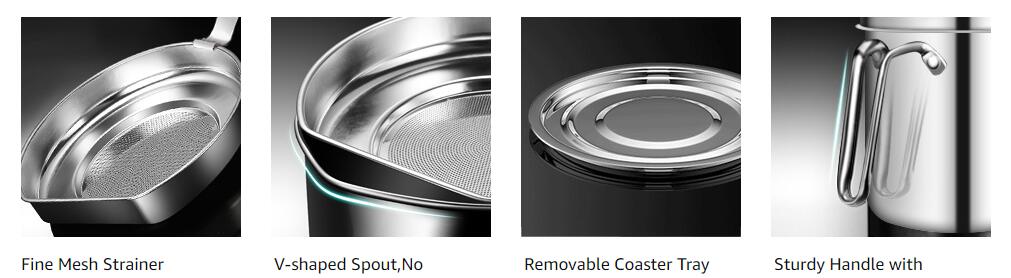 - 【Ergonomics Design】Bacon Grease Container with dust-proof lid,sturdy handle with ergonomic design for comfortable and anti-scalding grip,V-shaped spout with no drips and dribbles,anti-slip base base prevents oil spillage onto the countertop.