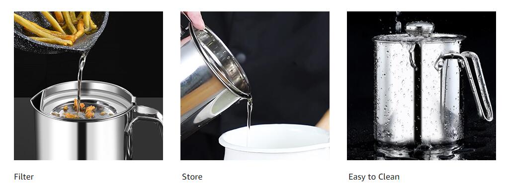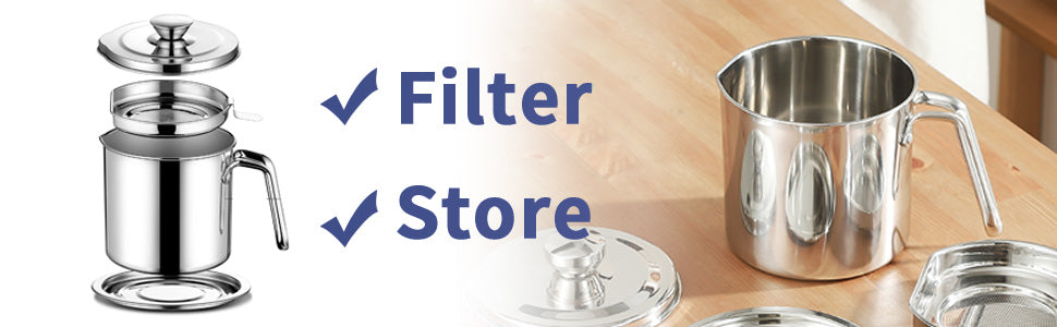 - 【Filtration & Cleaning】Pour the melted bacon grease into the oil grease container. The fine mesh filter can filter out the residue in the oil and help you make better use of the cooking oil. 13.5 cm/5.3 inch large diameter, easy to clean by hand.Note:please do not soak and scrub the stainless steel cooking oil filter for a long time. If you clean the filter, please dry it as soon as possible.
