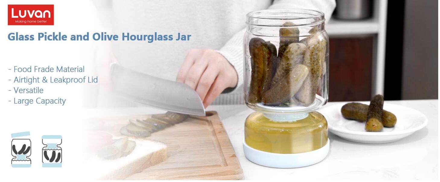 Glass Pickle Jar, 34oz Olive Hourglass Jar with Strainer