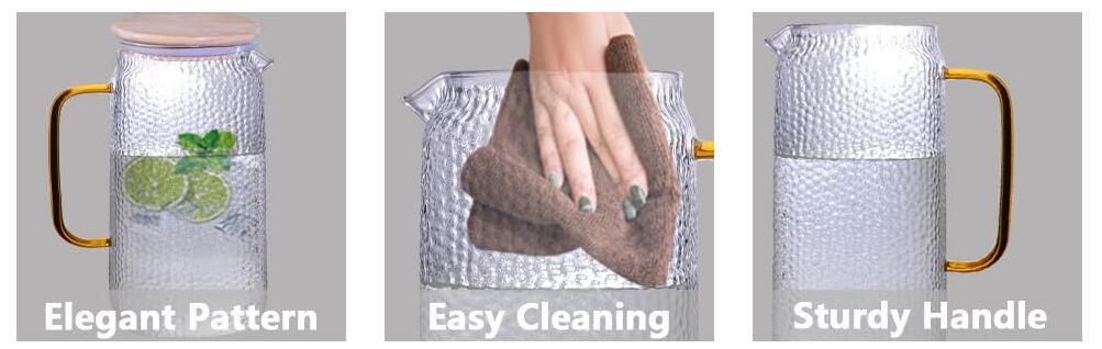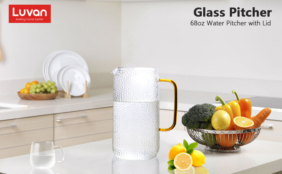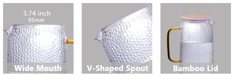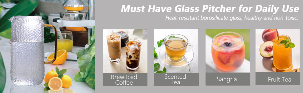 - ★Food-Grade High-Borosilicate Glass: This Glass Picher Made from durable high-borate borosilicate glass, and it can withstand temperature range from -4℉ to 1040℉,Suitable for both hot or cold drinks like iced tea,hot tea.