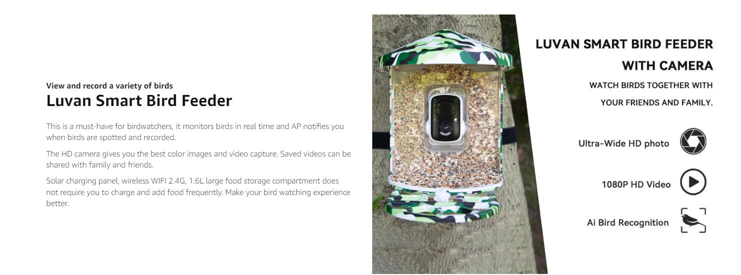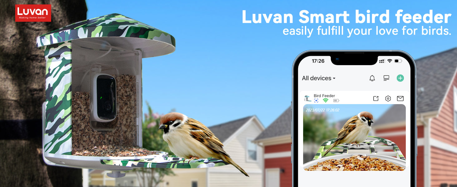 - 【Capture Enchanting Bird Moments Anytime, Anywhere】Never miss a moment of wonder, and get up close with the birds. The luvan Bird Feeder Camera automatically captures and records videos of all the feathered visitors at the feeder. Receive real-time notifications on your app. Whether you are at home or away, you can witness these fascinating creatures up close. Let's explore the beauty of nature together, embrace intimate encounters with birds, and illuminate your bird-watching journey!